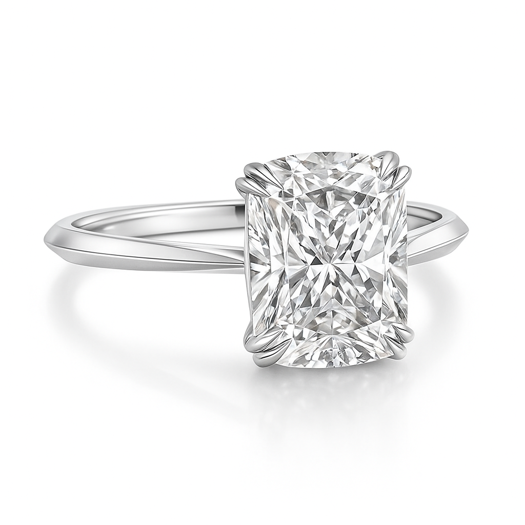 At its centre sits a captivating elongated cushion-cut diamond, chosen for its soft contours and exceptional brilliance. The centre stone is secured by refined double talon claws, offering both strength and a bold architectural beauty that enhances the diamond’s natural fire. Set upon a polished band of precious metal, The Ashby balances contemporary design with classic luxury.