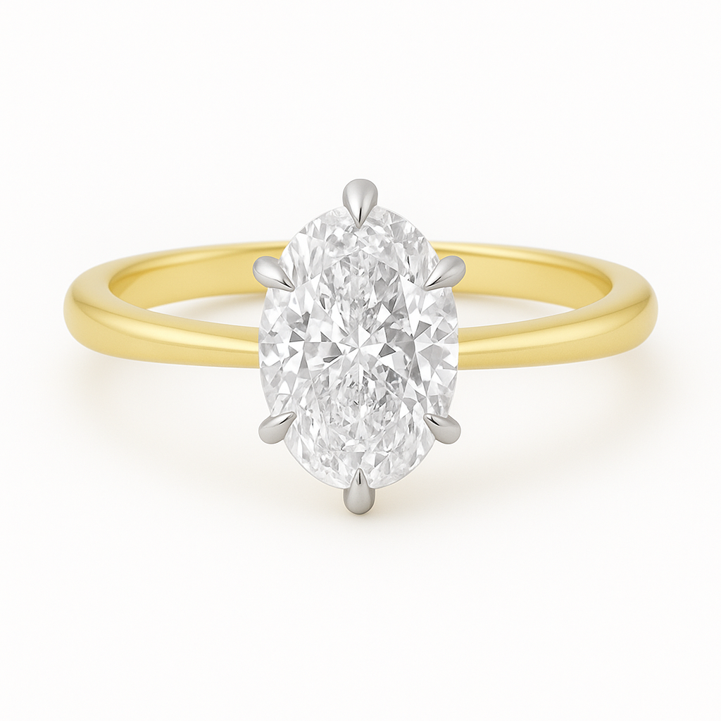 The focal point of this striking engagement ring is a brilliant Oval-cut Diamond, carefully selected for its exceptional sparkle and graceful shape. Set in a refined band of Gold or Platinum. The minimalistic aesthetic of the design allows the diamond to take centre stage with no fuss showcasing its beauty and brilliance.