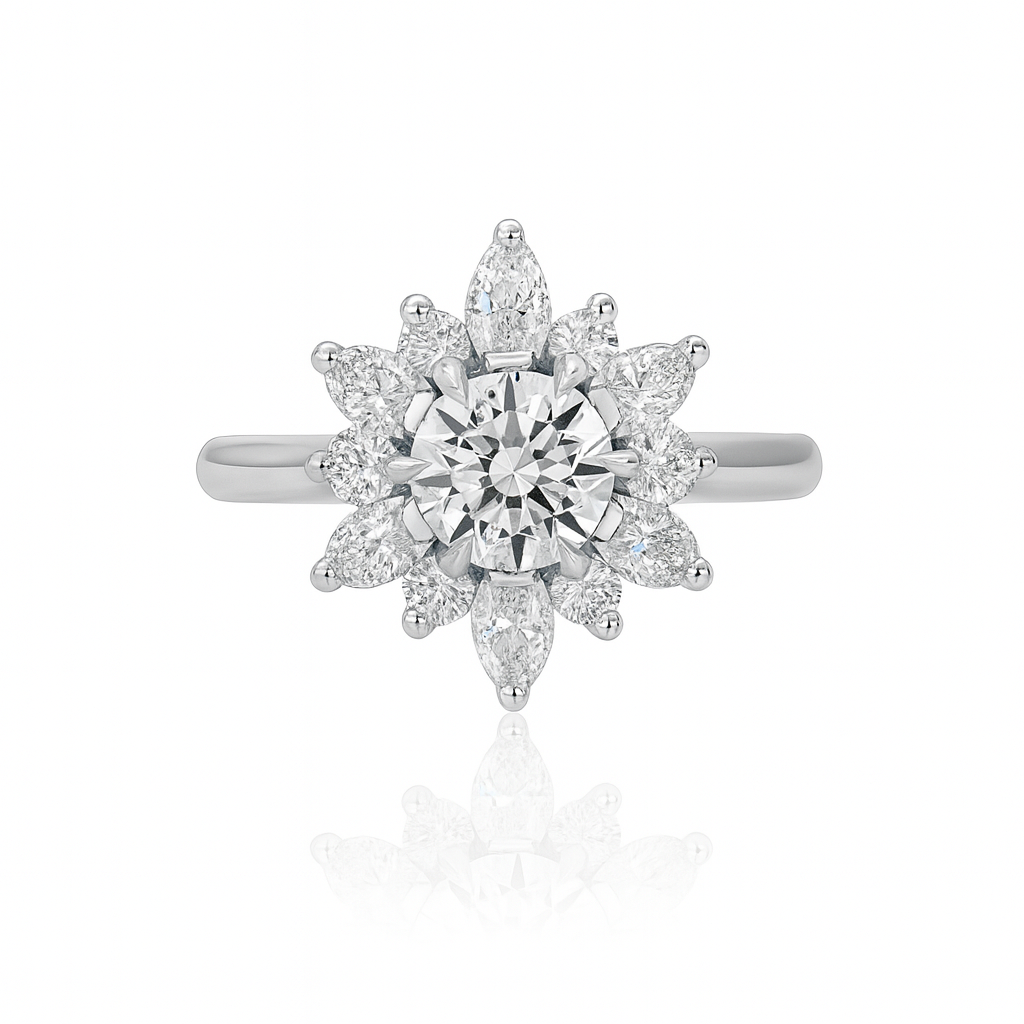 A timeless piece with a modern edge, this Diamond Cluster Ring beautifully fuses tradition with contemporary style. At its heart lies a dazzling brilliant-cut centre diamond, radiating light from every angle. Surrounding it, an elegant arrangement of round and pear-shaped diamonds are delicately claw set, creating a striking cluster design that enhances brilliance and presence.