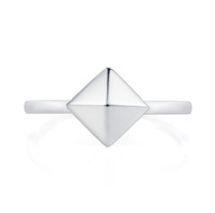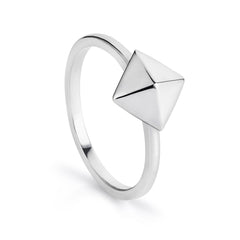 A geometric, stack-able ring, made by Karl Karter. The silver pyramid ring interlocks with itself, the mini nucleus rings as well as plain or eternity bands. Mix metal finishes, shapes and even add stones to personalise your pieces. This ring is hand-made in our London Rocks Workshop, below our shop in Hatton Garden.