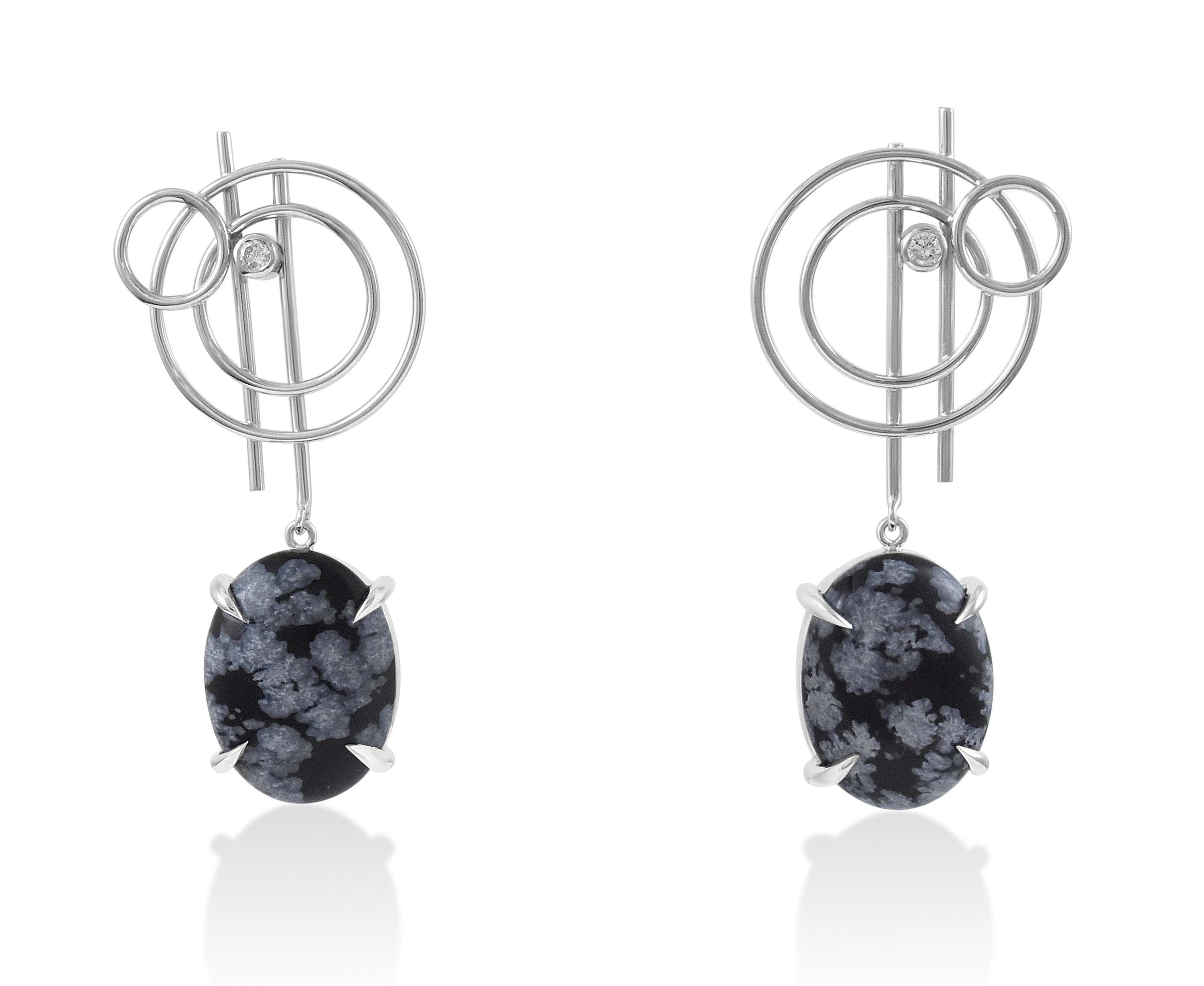 Bold yet elegant, these earrings are inspired by crop circles and their repetitive, concentric patterns. Beautiful monochrome pattern of Snowflake Obsidian. These one of a kind earrings are handmade at our London workshop.